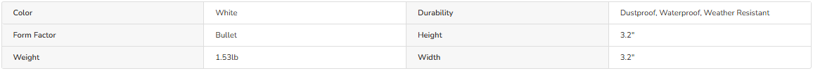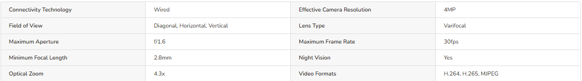 O4BDD1MMonitor an indoor or outdoor area with the white O4BDD1M Camera from Speco Technologies. This unit uses a 1/3" progressive scan CMOS sensor to capture 2592 x 1520 resolution video at 30 fps. IR LEDs provide up to 164' of night vision. The camera features a 2.8-12mm motorized varifocal lens that delivers a 94.2 to 29.8° horizontal field of view. Red and blue lights provide a visual deterrent to keep intruders at bay.